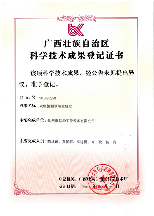 2014年1月20日,欽州市科學技術(shù)局組織有關(guān)專家對欽州市創(chuàng)華工控設(shè)備有限公司所承擔的“雙電極測量裝置研發(fā)”進行項目成果鑒定,鑒定委員會專家查閱了相關(guān)材料,聽取了承擔單位項目介紹,進行了質(zhì)疑答辯,經(jīng)過認真討論認為本項目利用高新技術(shù)改造傳統(tǒng)制糖產(chǎn)業(yè),有利于促進我國制糖行業(yè)的技術(shù)裝備水平的提升,研究成果達到了國內(nèi)領(lǐng)先水平。